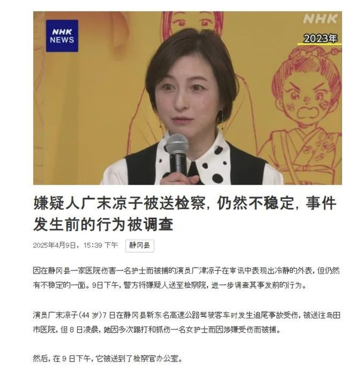 4月8日,44岁的日本女演员广末凉子袭击护士被警方逮捕。9日下午,警方将广末凉子送至检察院,并进一步调查其事发前的行为。据悉,广末凉子接受了简易药检,结果呈阴性,但警方仍对事件保持高度谨慎态度。